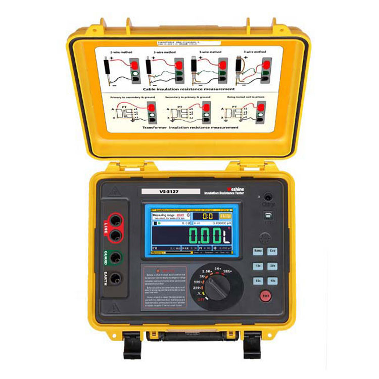 Weshine® VS-3127 là thiết bị chạy bằng pinKiểm tra điện trở cách điện của máy biến ápvới màn hình hồ quang kỹ thuật số và tương tự, được thiết kế để kiểm tra điện trở cách điện điện áp cao trong bảo trì và bảo dưỡng cáp, máy móc nhà máy quay, máy biến áp, thiết bị đóng cắt và các ứng dụng công nghiệp.