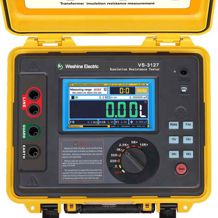 VS-3127 VS-3127Kiểm tra máy đo Megohmcung cấp khả năng thực hiện các phép đo điện trở cách điện chính xác lên đến điện áp thử nghiệm 15 kV với điện trở tối đa 30 TΩ. Độ chính xác đo điện trở là ± 5 % từ 1 MΩ đến 3 TΩ! Đối với các công ty dịch vụ và tiện ích, VS-3127 là một công cụ thử nghiệm toàn diện với tính linh hoạt và khả năng kiểm chứng trong tương lai. Weshine VS-3127 được thiết kế để hoạt động ở mọi nơi bạn làm việc. Điện áp định mức đầu ra tối đa đạt 7 bánh răng (250Vï¼500Vï¼1KVï¼2.5KVï¼5KVï¼10KVï¼15KV). Dòng ngắn mạch tối đa 7mA Kiểm tra điện trở cách điện (IR), kiểm tra chỉ số phân cựcï¼PI), kiểm tra tỷ lệ hấp thụ điện môi (DAR). Chế độ kiểm tra độ dốc (RAMP), chế độ kiểm tra điện trở lọc (FR). * Kiểm tra điện dung (Cap.). Chức năng theo dõi điện áp, tự động theo dõi điện áp trực tiếp của thiết bị đo được