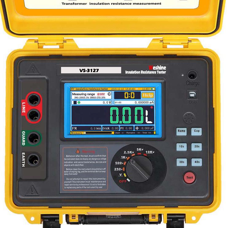 VS-3127 VS-3127Chỉ số phân cực của máy biến ápcung cấp khả năng thực hiện các phép đo điện trở cách điện chính xác ở điện áp thử nghiệm lên tới 15 kV với điện trở tối đa 30 TΩ. Độ chính xác đo điện trở là ± 5 % từ 1 MΩ đến 3 TΩ! Đối với các công ty dịch vụ và tiện ích, VS-3127 là thiết bị thử nghiệm toàn diện với tính linh hoạt và khả năng kiểm chứng trong tương lai. Weshine VS-3127 được thiết kế để hoạt động ở bất cứ nơi đâu bạn làm việc. Điện áp định mức đầu ra tối đa đạt 7 bánh răng (250V,500V,1KV,2,5KV,5KV,10KV,15KV). Dòng ngắn mạch tối đa 7mA Kiểm tra điện trở cách điện (IR), kiểm tra chỉ số phân cực (PI), kiểm tra tỷ lệ hấp thụ điện môi (DAR). Chế độ kiểm tra đoạn đường nối (RAMP), chế độ kiểm tra điện trở lọc (FR). *Kiểm tra điện dung (Cap.). Chức năng giám sát điện áp, tự động theo dõi điện áp trực tiếp của thiết bị đo